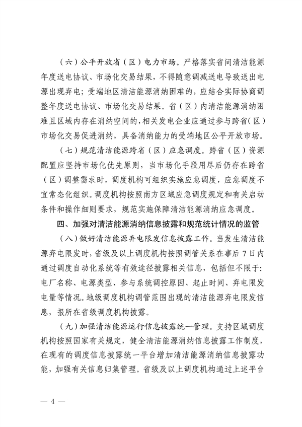 第三部分是加強(qiáng)對(duì)清潔能源跨省(區(qū))消納情況監(jiān)管。包括公平開(kāi)放?。▍^(qū))電力市場(chǎng)、規(guī)范清潔能源跨?。▍^(qū))應(yīng)急調(diào)度。要求嚴(yán)格落實(shí)省間清潔能源年度送電協(xié)議、市場(chǎng)化交易結(jié)果,不得隨意調(diào)減送電導(dǎo)致送出電源出現(xiàn)棄電。存在消納困難的,發(fā)電企業(yè)通過(guò)市場(chǎng)化交易促進(jìn)消納。調(diào)度機(jī)構(gòu)要按照南方區(qū)域應(yīng)急調(diào)度規(guī)定的啟動(dòng)條件和操作細(xì)則要求,規(guī)范實(shí)施保障清潔能源消納應(yīng)急調(diào)度。