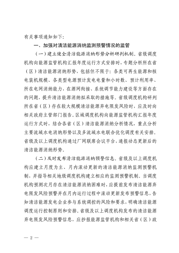 第一部分是加強(qiáng)對(duì)清潔能源消納監(jiān)測(cè)預(yù)警情況的監(jiān)管。包括建立健全清潔能源消納形勢(shì)分析研判機(jī)制、及時(shí)發(fā)布清潔能源消納預(yù)警信息。要求調(diào)度機(jī)構(gòu)做好清潔能源消納形勢(shì)全面分析匯報(bào)工作,建立清潔能源消納監(jiān)測(cè)預(yù)警機(jī)制,預(yù)測(cè)存在消納困難時(shí),提前發(fā)布棄電限發(fā)風(fēng)險(xiǎn)預(yù)警并滾動(dòng)更新信息,按規(guī)定報(bào)送能源監(jiān)管機(jī)構(gòu)和相關(guān)?。▍^(qū))政府主管部門(mén)。發(fā)電企業(yè)要加強(qiáng)水情和新能源功率預(yù)測(cè)系統(tǒng)運(yùn)行和應(yīng)用,提高準(zhǔn)確性和時(shí)效性。
