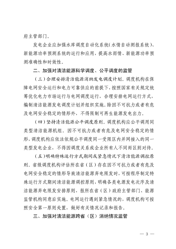 第二部分是加強(qiáng)對(duì)清潔能源科學(xué)調(diào)度、公平調(diào)度的監(jiān)管。包括合理安排清潔能源消納發(fā)電調(diào)度計(jì)劃、堅(jiān)持清潔能源公平調(diào)度原則、明確特殊運(yùn)行方式期間或緊急情況下清潔能源調(diào)控原則。調(diào)度機(jī)構(gòu)要在保障電網(wǎng)安全和電力可靠供應(yīng)前提下,合理編制清潔能源發(fā)電調(diào)度計(jì)劃并組織實(shí)施,依法依規(guī)公平調(diào)用同類型清潔能源機(jī)組,按程序制定特殊運(yùn)行方式期間清潔能源調(diào)控原則,明確各類電源發(fā)電次序及清潔能源棄電限發(fā)安排原則。