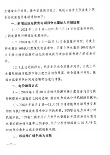 2023年8月1日—12月31日全容量并網(wǎng)的,月度上網(wǎng)電量的80%執(zhí)行燃煤發(fā)電基準價,月度上網(wǎng)電量的20%可選擇自主參與清潔能源市場化交易或執(zhí)行清潔能源市場月度交易均價。