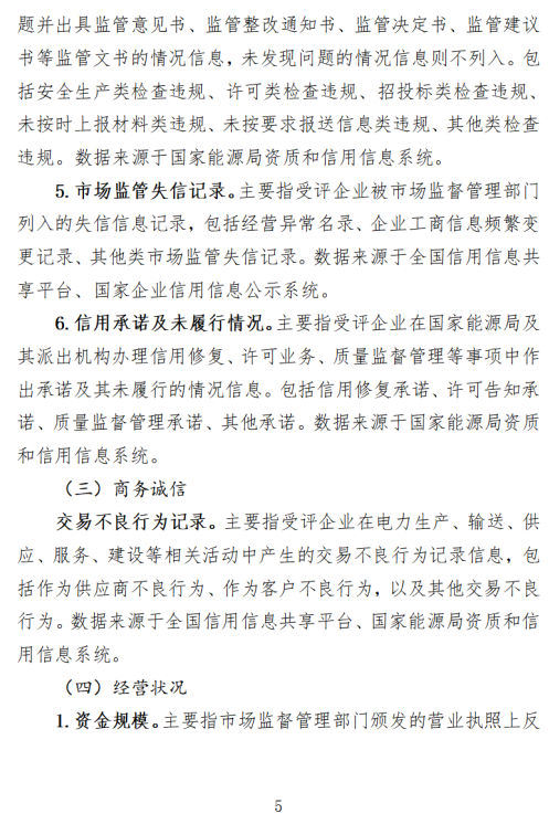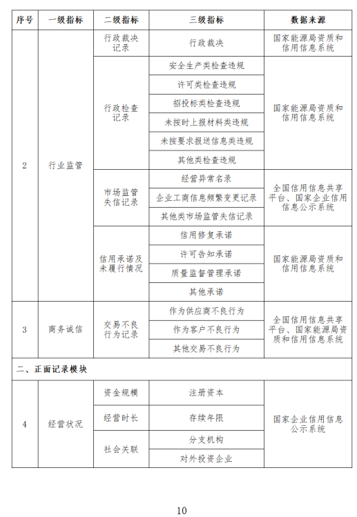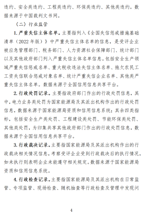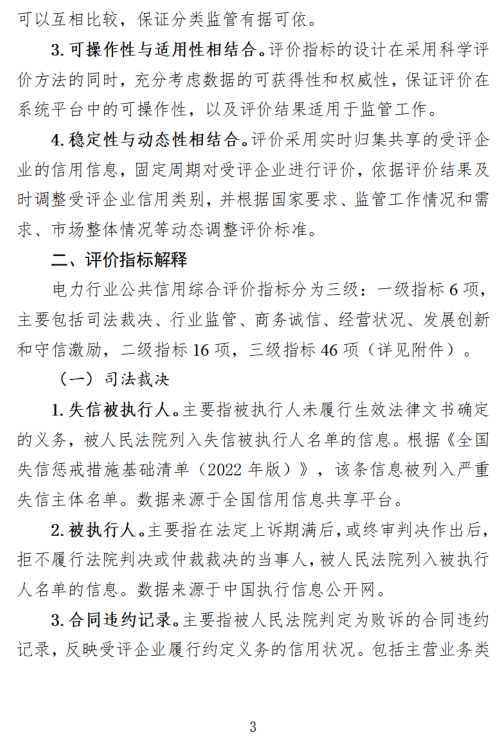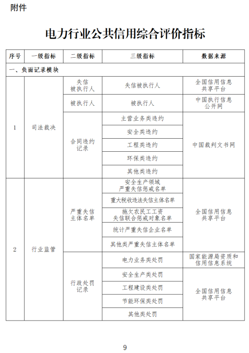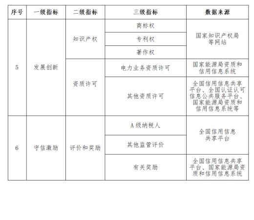 近日,國家能源局印發(fā)《電力行業(yè)公共信用綜合評價標(biāo)準(zhǔn)(試行)》的通知(國能發(fā)資質(zhì)規(guī)〔2023〕28號),明確提出“電力行業(yè)公共信用綜合評價指標(biāo)分為三級:一級指標(biāo)6項,主要包括司法裁決、行業(yè)監(jiān)管、商務(wù)誠信、經(jīng)營狀況、發(fā)展創(chuàng)新和守信激勵,二級指標(biāo)16項,三級指標(biāo)46項”。原文如下: