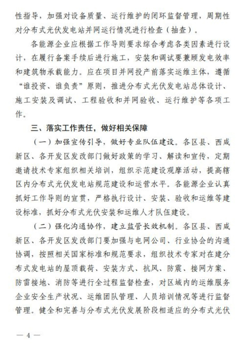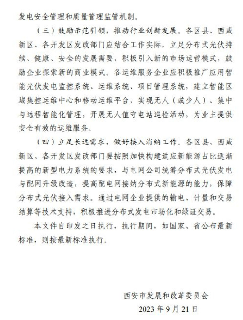 9月21日,西安市發(fā)改委發(fā)布《推進西安市分布式光伏電站建設工作導則(試行)》的通知,分布式光伏發(fā)電站可采用“自發(fā)自用”“自發(fā)自用,余電上網”或者“全額上網”等并網模式,所有新建、擴建或改建的分布式光伏發(fā)電站,履行項目備案、設計、安裝和驗收程序;戶用(自然人)分布式光伏發(fā)電站裝機容量原則上不超過50kW,且不得超過超出宅基地范圍;非自然人分布式光伏發(fā)電站單點并網裝機容量不超過6000kW,整村開發(fā)模式在電網無消納受限的區(qū)域,不設容量規(guī)模限制。