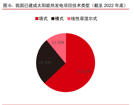 我國(guó)已建成光熱項(xiàng)目中,塔式光熱占比相對(duì)較高。根據(jù) CSTA 數(shù)據(jù),截至 2021 年底, 全球太陽能熱發(fā)電累計(jì)裝機(jī)容量達(dá)到 6.8GW,槽式、塔式、線性菲涅耳技術(shù)裝機(jī)在全球主 要國(guó)家和地區(qū)的占比為 76%、20%和 4%。截至 2022 年底,我國(guó)太陽能熱發(fā)電累計(jì)裝機(jī) 容量為 588MW(含 MW 級(jí)以上規(guī)模的發(fā)電系統(tǒng)),塔式光熱電站雖然前期系統(tǒng)建設(shè)一次性投資較大且維護(hù)成本較高,但更適合我國(guó)西部地區(qū)晝夜溫差大、缺少水資源、自然環(huán)境 惡劣等特點(diǎn),同時(shí)因槽式系統(tǒng)和線菲式系統(tǒng)集熱效率偏低、對(duì)工質(zhì)加熱能力較弱等因素, 因而在我國(guó)塔式光熱電站應(yīng)用范圍相對(duì)較廣。