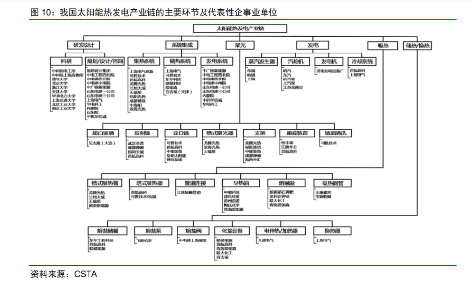 光熱發(fā)電產(chǎn)業(yè)鏈體系可分為研發(fā)、設(shè)計(jì)、制造、安裝等環(huán)節(jié),產(chǎn)業(yè)鏈國(guó)產(chǎn)化程度較高。 根據(jù) CSTA 數(shù)據(jù)顯示,在國(guó)家第一批光熱發(fā)電示范項(xiàng)目中,設(shè)備、材料國(guó)產(chǎn)化率超過 90%, 技術(shù)及裝備的可靠性和先進(jìn)性在電站投運(yùn)后得到有效驗(yàn)證;在青海中控德令哈 50MW 塔 式光熱發(fā)電項(xiàng)目中,設(shè)備和材料國(guó)產(chǎn)化率已達(dá)到 95%以上。