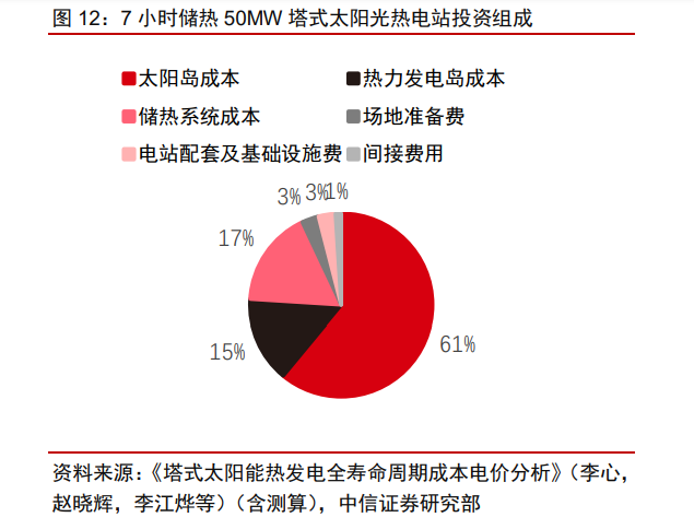 塔式太陽能熱電站中太陽島建設(shè)成本是電站建設(shè)的主要成本。太陽能熱發(fā)電站建造成 本主要分設(shè)備費(fèi)、安裝費(fèi)和土建費(fèi)三部分。綜合《塔式太陽能熱發(fā)電全壽命周期成本電價(jià) 分析》(李心,趙曉輝,李江燁等著)的測(cè)算數(shù)據(jù)來看,對(duì)于 10MW 以上的塔式太陽能熱 發(fā)電站而言,太陽島(含聚光系統(tǒng)和吸熱系統(tǒng))成本占電站建造成本的 55%以上;以 50MW 塔式太陽能熱發(fā)電電站為例,其太陽島成本高達(dá) 61%,熱力發(fā)電島(含熱力系統(tǒng)及輔機(jī)設(shè) 備、水循環(huán)、水處理系統(tǒng)、換熱設(shè)備、熱工控制系統(tǒng)、電氣系統(tǒng)、電網(wǎng)接入系統(tǒng)及儀表閥 門管路等)成本約 15%,儲(chǔ)熱系統(tǒng)成本約 17%。