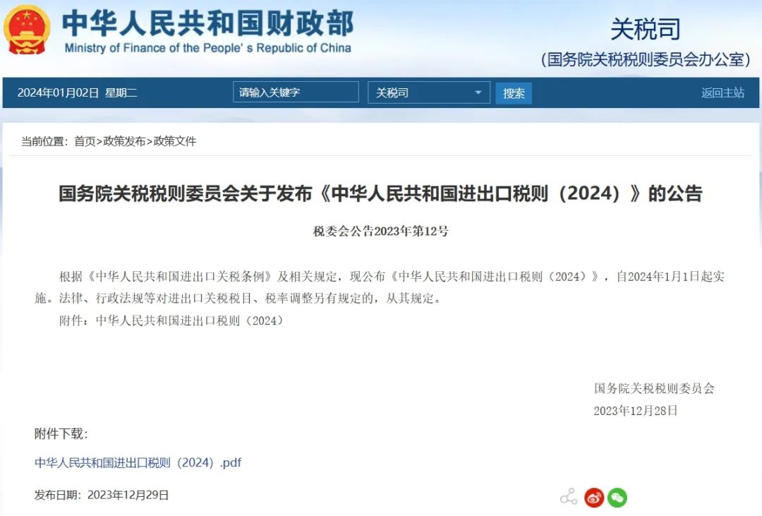 2023年12月29日,國務(wù)院關(guān)稅稅則委員會(huì)公布《中華人民共和國進(jìn)出口稅則(2024)》,自2024年1月1日起實(shí)施。相對(duì)于之前發(fā)布的公告,本次公布了進(jìn)出口產(chǎn)品具體的稅則,其中包含煤炭。