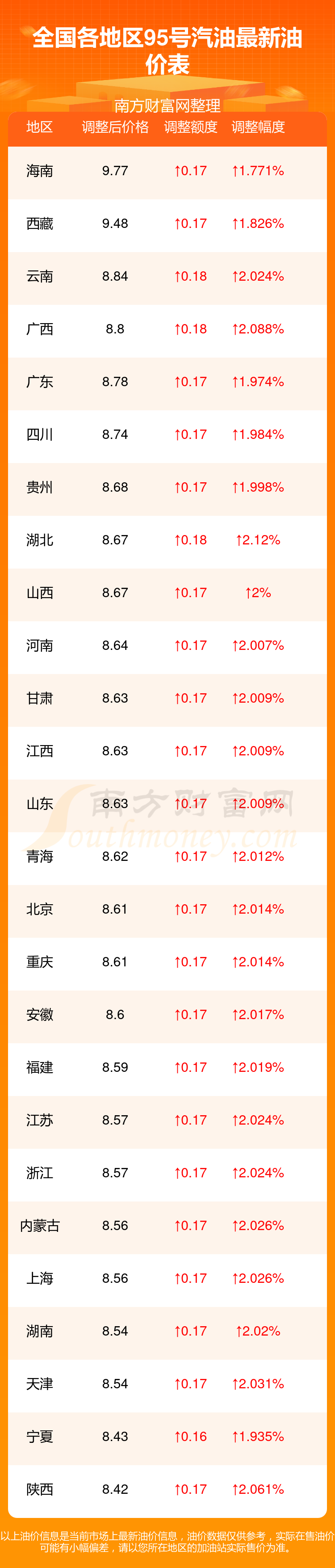 全國95號汽油4月2日的最新價格是4月2日油價調(diào)整后的價格,詳情如下:平均價格為9元/升,最低的是陜西,價格8.42元/升,最高的是海南,價格9.77元/升。