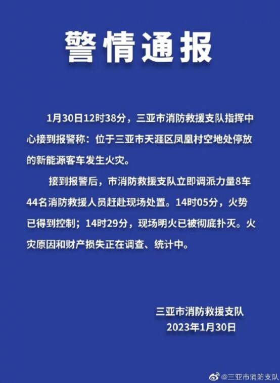 另據(jù)三亞市消防支隊通報稱,30日12時38分,三亞市消防救援支隊指揮中心接到報警稱:位于三亞市天涯區(qū)鳳凰村空地處停放的新能源客車發(fā)生火災。支隊調(diào)派8車44名消防救援人員趕赴現(xiàn)場處置。14時05分,火勢已得到控制;14時29分,現(xiàn)場明火已被徹底撲滅?;馂脑蚝拓敭a(chǎn)損失正在調(diào)查、統(tǒng)計中。