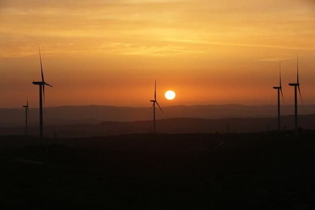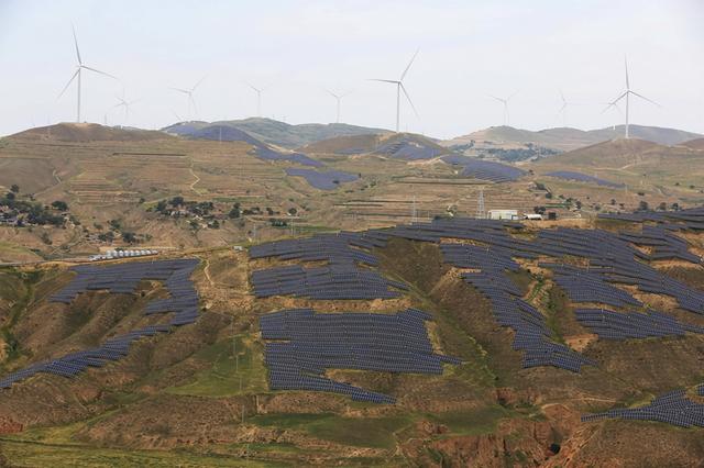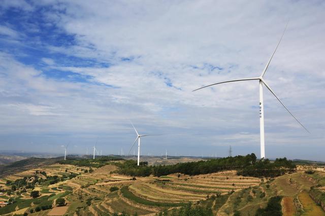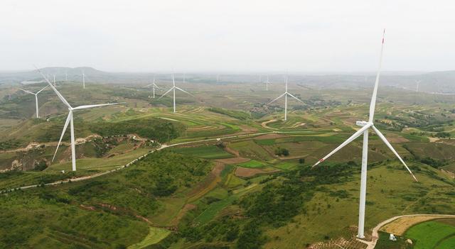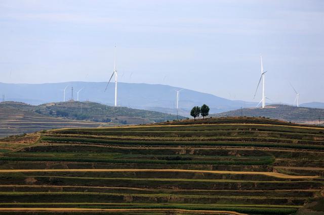 夏日時節(jié),在位于黃土高原的甘肅省定西市,風電基地風機迎風旋轉(zhuǎn),與梯田、村莊相映成景,蔚為壯觀。