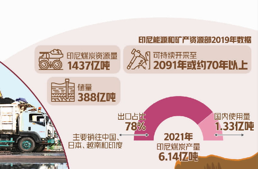 根據(jù)印尼能源和礦產(chǎn)資源部2019年數(shù)據(jù),印尼煤炭資源量為1437億噸,儲量為388億噸,可以持續(xù)開采到2091年或大約70年以上。2021年,印尼煤炭產(chǎn)量達到6.14億噸,而國內(nèi)使用量僅為1.33億噸,78%用于出口,是世界上動力煤出口量最大的國家,主要銷往中國、日本、越南和印度。