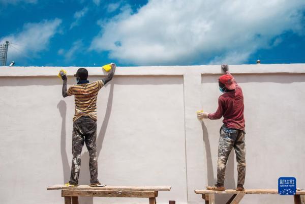 6月2日,在中非共和國首都班吉附近的賓博市,薩卡伊光伏電站的當(dāng)?shù)貑T工在粉刷墻壁。新華社記者羅毓攝