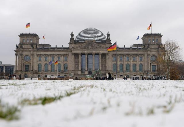 11月20日,在德國(guó)柏林,德國(guó)國(guó)會(huì)大廈前的草坪被積雪覆蓋。新華社發(fā)(斯特凡·蔡茨攝)