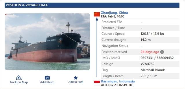 此前船舶數(shù)據(jù)顯示,裝載澳大利亞煤炭的Magic Eclipse號貨輪駛向湛江港
