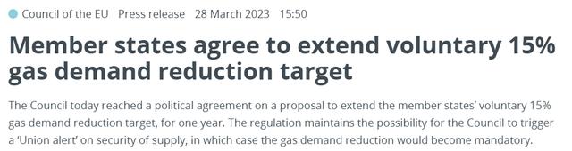 為應(yīng)對(duì)能源危機(jī),歐盟成員國當(dāng)?shù)貢r(shí)間3月28日達(dá)成協(xié)議,同意將“自愿減少15%天然氣消費(fèi)的計(jì)劃”延長一年。