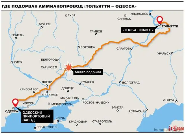 “陶里亞蒂-敖德薩”液氨輸送管道建于20世紀(jì)70年代,1979年10月首次投入使用,并于1981年全部投產(chǎn)。管道全長(zhǎng)2470公里,從俄羅斯陶里亞蒂延伸至烏克蘭敖德薩等三個(gè)黑海港口,是世界上最長(zhǎng)的液氨管道之一,產(chǎn)能可達(dá)250萬(wàn)噸/年。俄羅斯通過(guò)這條管道輸送的氨氣可以生產(chǎn)約200萬(wàn)噸肥料,足夠種植養(yǎng)活4500萬(wàn)人的莊稼。