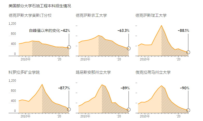 在美國的大學(xué)里,石油工程專業(yè)的新生人數(shù)已經(jīng)減少到10多年前水力壓裂熱潮開始前的最低水平。歐洲的大學(xué)過去曾為在中東和亞洲開展能源業(yè)務(wù)的公司培育了許多工程師,但現(xiàn)在也已看到了類似的降溫趨勢!