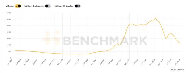 從2018年10月至今的基準(zhǔn)鋰價格指數(shù)(按市場交易量加權(quán)) 來源:Benchmark Mineral Intelligence