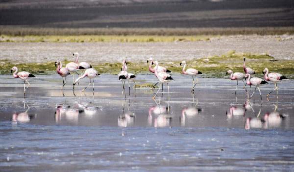 阿根廷一鋰鹽湖附近的火烈鳥。每年夏天,火烈鳥都會聚集在阿根廷、玻利維亞和智利安第斯山脈的鹽沼和瀉湖中覓食和筑巢。 Ganfeng Lithium 圖