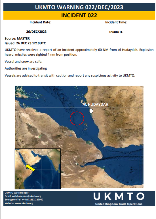 通報顯示,爆炸發(fā)生的大概位置在距離也門西海岸荷臺達港約60海里(約111公里)的紅海海域,距離報告本次事件的船只約8公里。英國海上貿(mào)易行動辦公室表示,這艘船在26日航行時看到事發(fā)地點出現(xiàn)了2架無人機和導(dǎo)彈(或指發(fā)射物),隨后聽到了爆炸聲。報道稱,無人機沒有裝載武器,目前尚不清楚爆炸的具體原因。