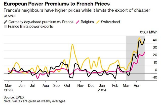 據(jù)法國(guó)電網(wǎng)運(yùn)營(yíng)商RTE稱,自3月初以來(lái),向比利時(shí)、德國(guó)、瑞士和意大利輸送電力的能力已經(jīng)減少。這使得這些國(guó)家無(wú)法進(jìn)口更便宜的法國(guó)核電,并推高了整個(gè)地區(qū)的批發(fā)價(jià)格。根據(jù)RTE的說(shuō)法,這些限制應(yīng)該在5月初得到解決,但從8月中旬開始可能會(huì)有更多的限制。