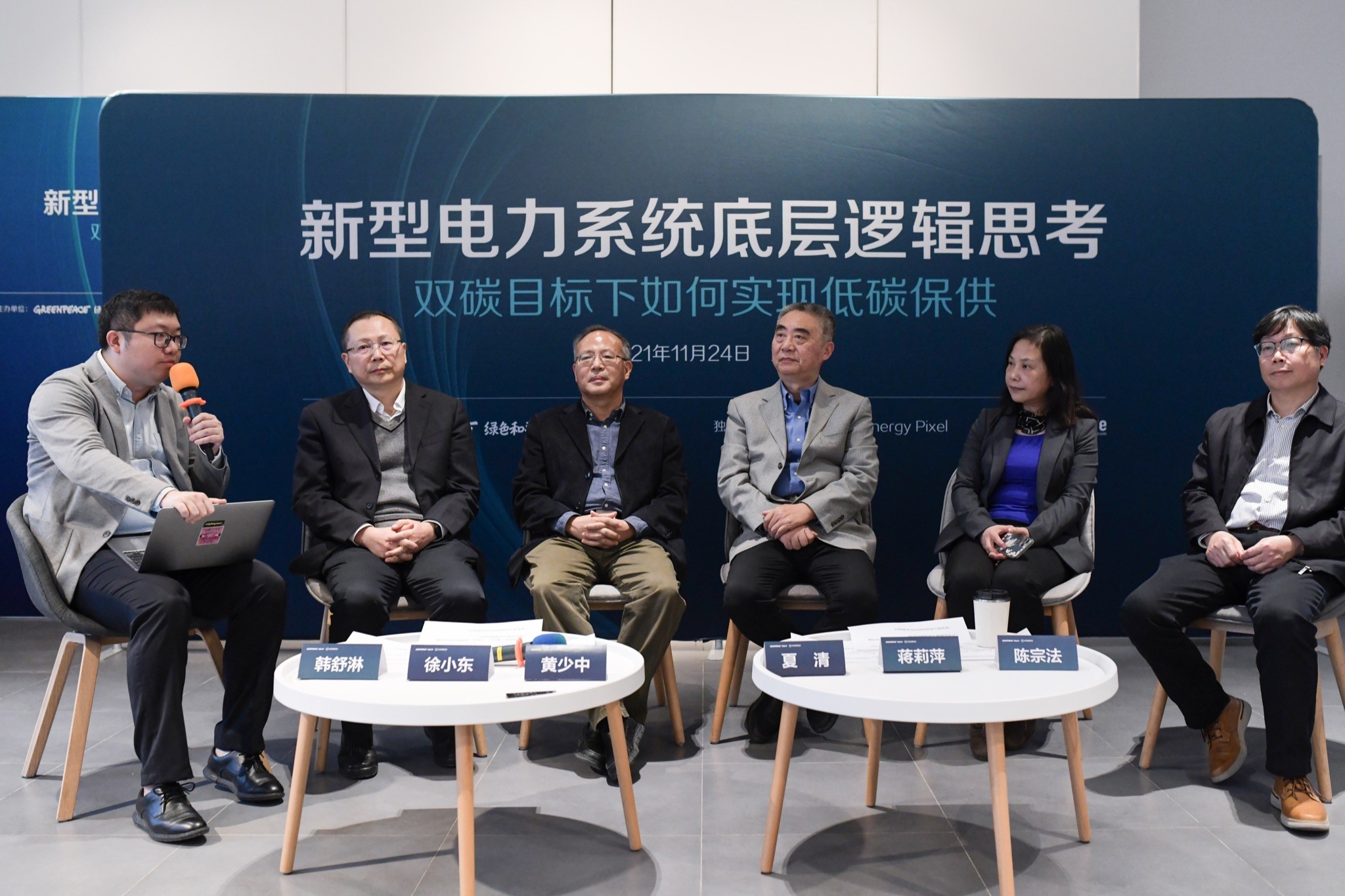 從左至右依次為:《財(cái)經(jīng)雜志》記者韓舒淋、電力規(guī)劃設(shè)計(jì)總院高級(jí)顧問(wèn)徐小東、中國(guó)能源研究會(huì)研究員黃少中、清華大學(xué)能源互聯(lián)網(wǎng)智庫(kù)研究中心主任夏清教授、國(guó)網(wǎng)能源研究院副院長(zhǎng)蔣莉萍、中國(guó)能源研究會(huì)理事陳宗法。