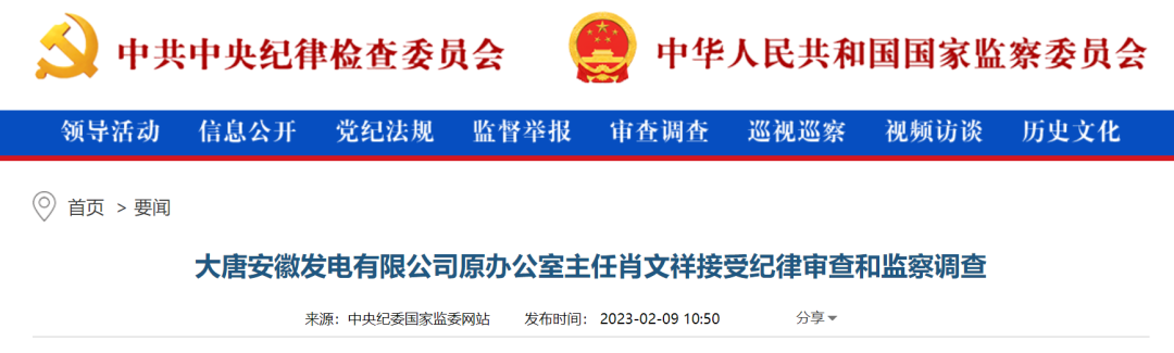 中央紀委國家監(jiān)委網(wǎng)站訊2月9日消息,據(jù)中國大唐集團有限公司紀檢監(jiān)察組、安徽省監(jiān)察委員會消息:大唐安徽發(fā)電有限公司原辦公室主任肖文祥涉嫌嚴重違紀違法,目前正接受中國大唐集團有限公司紀檢監(jiān)察組紀律審查和安徽省淮北市監(jiān)察委員會監(jiān)察調(diào)查。