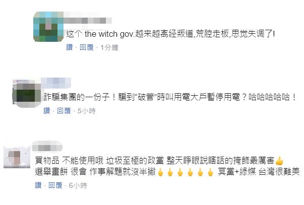 國(guó)民黨臺(tái)北市議員柳采葳怒批,民眾與業(yè)者不應(yīng)該成為蔡當(dāng)局錯(cuò)誤政策的犧牲品,若要求業(yè)者限制冷氣溫度,不然從蔡英文自己做起,“不敢說(shuō)臺(tái)灣缺電,卻要限制大家的冷氣溫度,笑死耶!大家一起要求蔡英文辦公室和她的官邸禁開(kāi)冷氣,不要只會(huì)找民眾麻煩”。