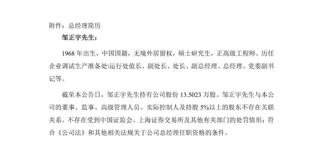 中國核電于4月25日召開第四屆董事會第十一次會議,審議通過了《關(guān)于聘任公司總經(jīng)理的議案》,決定聘任鄒正宇先生擔(dān)任公司總經(jīng)理職務(wù),任期自董事會審議通過之日起至本屆董事會任期屆滿日止。