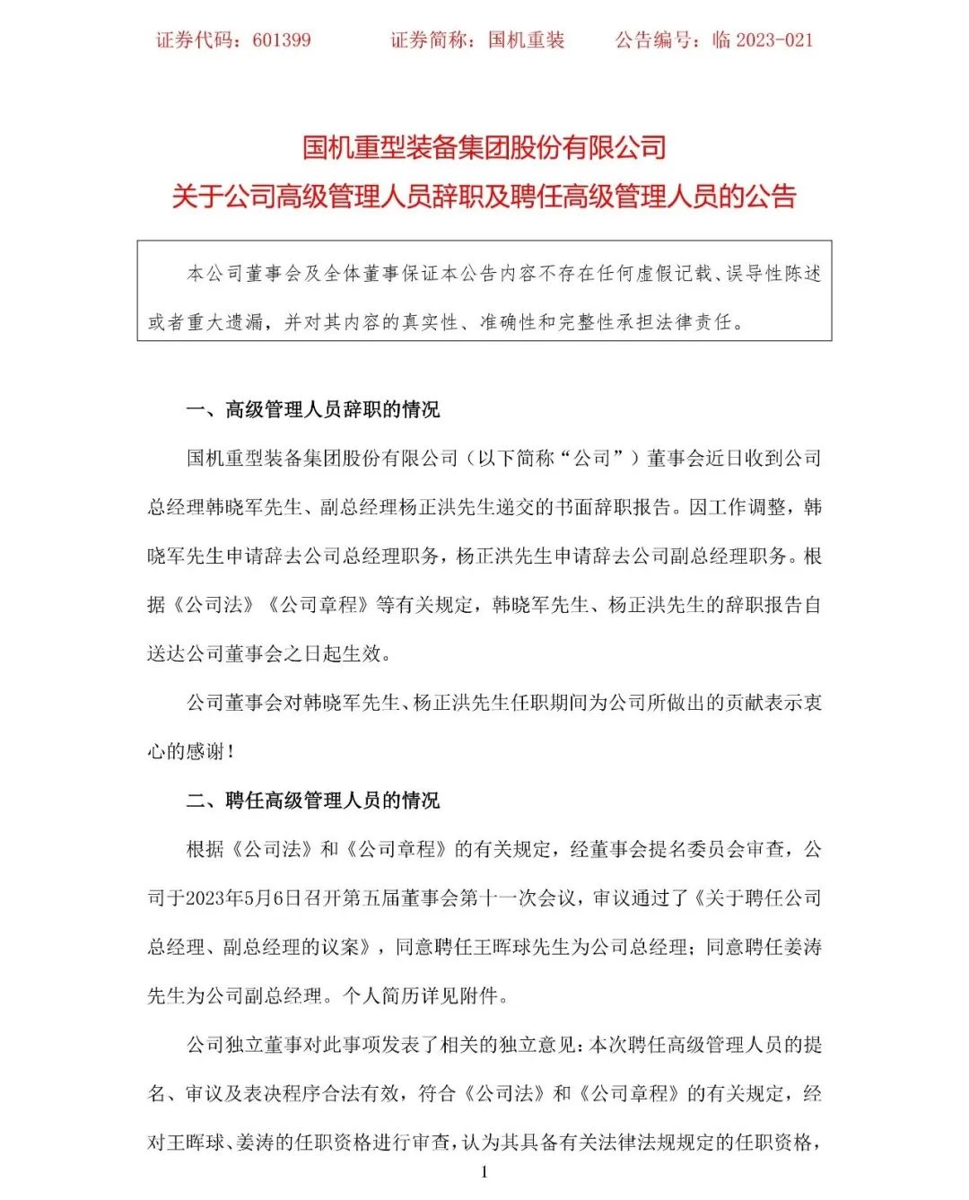 5月8日,國(guó)機(jī)重裝發(fā)布公告,董事會(huì)近日收到公司總經(jīng)理韓曉軍、副總經(jīng)理?xiàng)钫檫f交的書(shū)面辭職報(bào)告。因工作調(diào)整,韓曉軍申請(qǐng)辭去公司總經(jīng)理職務(wù),楊正洪申請(qǐng)辭去公司副總經(jīng)理職務(wù)。