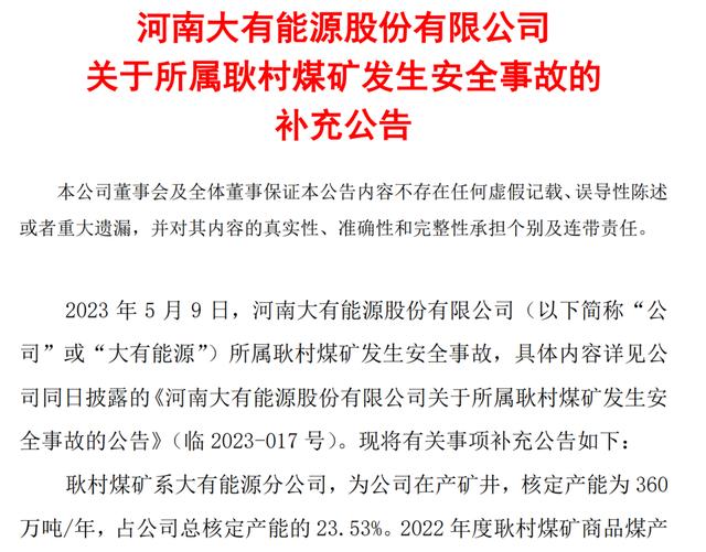 公告顯示,耿村煤礦系大有能源分公司,為公司在產(chǎn)礦井,核定產(chǎn)能為 360 萬噸/年,占公司總核定產(chǎn)能的 23.53%。2022 年度耿村煤礦商品煤產(chǎn) 量 287.45 萬噸,營業(yè)收入 13.22 億元,分別占公司同期商品煤產(chǎn)量 的 24.83%和營業(yè)收入的 15.39%。2023 年第一季度耿村煤礦商品煤產(chǎn) 量 51.51 萬噸,營業(yè)收入 2.15 億元,分別占公司同期商品煤產(chǎn)量的 18.32%和營業(yè)收入的 10.73%。目前,耿村煤礦正在組織實施停產(chǎn)救援,對公司造成的影響暫無法預(yù)測。公司將持續(xù)關(guān)注事故后續(xù)進(jìn)展并及時履行信息披露義務(wù),敬請廣大投資者注意投資風(fēng)險。