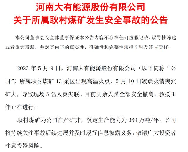 5月10日晚間大有能源公告,2023年5月9日,公司所屬耿村煤礦13采區(qū)出現(xiàn)高溫火點,5月10日凌晨火情突然擴大,導(dǎo)致現(xiàn)場5名人員失聯(lián)。目前其余人員全部安全撤離,救援工作正在進(jìn)行。