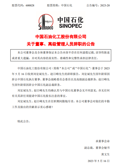 5月16日,中國(guó)石化發(fā)布公告,中國(guó)石油化工股份有限公司董事會(huì)于5月16日收到劉宏斌先生、趙日峰先生的辭職報(bào)告,劉宏斌先生因年齡原因辭去中國(guó)石化執(zhí)行董事、董事會(huì)戰(zhàn)略委員會(huì)委員以及高級(jí)副總裁職務(wù),趙日峰先生因年齡原因辭去中國(guó)石化副總裁職務(wù)。