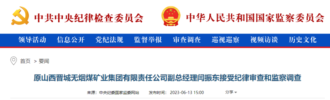 中央紀(jì)委國家監(jiān)委網(wǎng)站6月13日消息,據(jù)山西省紀(jì)委監(jiān)委消息:原山西晉城無煙煤礦業(yè)集團有限責(zé)任公司副總經(jīng)理閆振東涉嫌嚴(yán)重違紀(jì)違法,目前正接受山西省紀(jì)委監(jiān)委紀(jì)律審查和監(jiān)察調(diào)查。