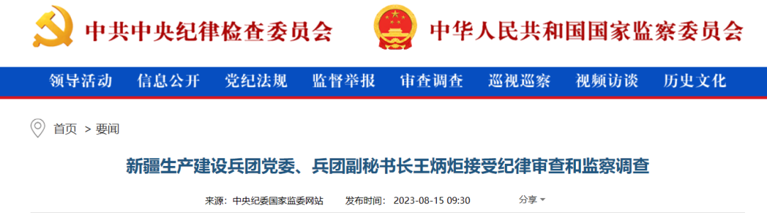 中央紀(jì)委國家監(jiān)委網(wǎng)站8月15日消息,據(jù)新疆生產(chǎn)建設(shè)兵團紀(jì)委監(jiān)委消息:新疆生產(chǎn)建設(shè)兵團黨委、兵團副秘書長王炳炬涉嫌嚴(yán)重違紀(jì)違法,目前正接受新疆生產(chǎn)建設(shè)兵團紀(jì)委監(jiān)委紀(jì)律審查和監(jiān)察調(diào)查。