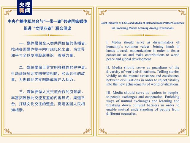 儀式上,發(fā)布了《中央廣播電視總臺(tái)與“一帶一路”共建國(guó)家媒體促進(jìn)“文明互鑒”聯(lián)合倡議》,呼吁媒體要做全人類(lèi)共同價(jià)值的傳播者、世界文明多樣性的守護(hù)者、人文交流合作的引領(lǐng)者。