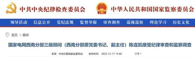國(guó)家電網(wǎng)西南分部三級(jí)顧問(wèn)(西南分部原黨委書(shū)記、副主任)陳連凱接受紀(jì)律審查和監(jiān)察調(diào)查