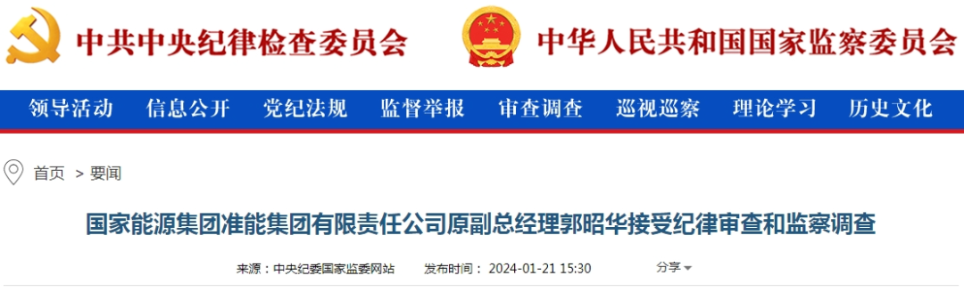 中央紀(jì)委國(guó)家監(jiān)委網(wǎng)站1月21日消息,據(jù)國(guó)家能源集團(tuán)紀(jì)檢監(jiān)察組、山西省紀(jì)委監(jiān)委消息:國(guó)家能源集團(tuán)準(zhǔn)能集團(tuán)有限責(zé)任公司原副總經(jīng)理郭昭華涉嫌嚴(yán)重違紀(jì)違法,目前正接受國(guó)家能源集團(tuán)紀(jì)檢監(jiān)察組和山西省大同市監(jiān)委紀(jì)律審查和監(jiān)察調(diào)查。