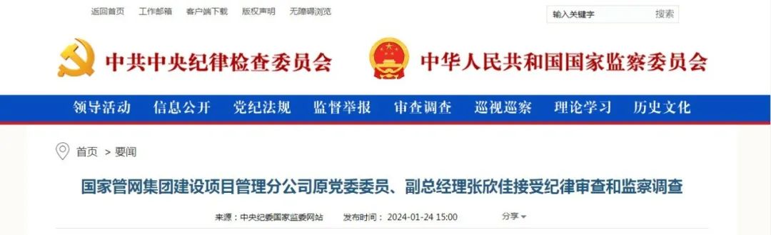 中央紀委國家監(jiān)委網(wǎng)站1月24日,據(jù)國家管網(wǎng)集團紀檢監(jiān)察組、遼寧省紀委監(jiān)委消息:國家管網(wǎng)集團建設(shè)項目管理分公司原黨委委員、副總經(jīng)理張欣佳涉嫌嚴重違紀違法,目前正接受國家管網(wǎng)集團紀檢監(jiān)察組和遼寧省錦州市監(jiān)委紀律審查和監(jiān)察調(diào)查。