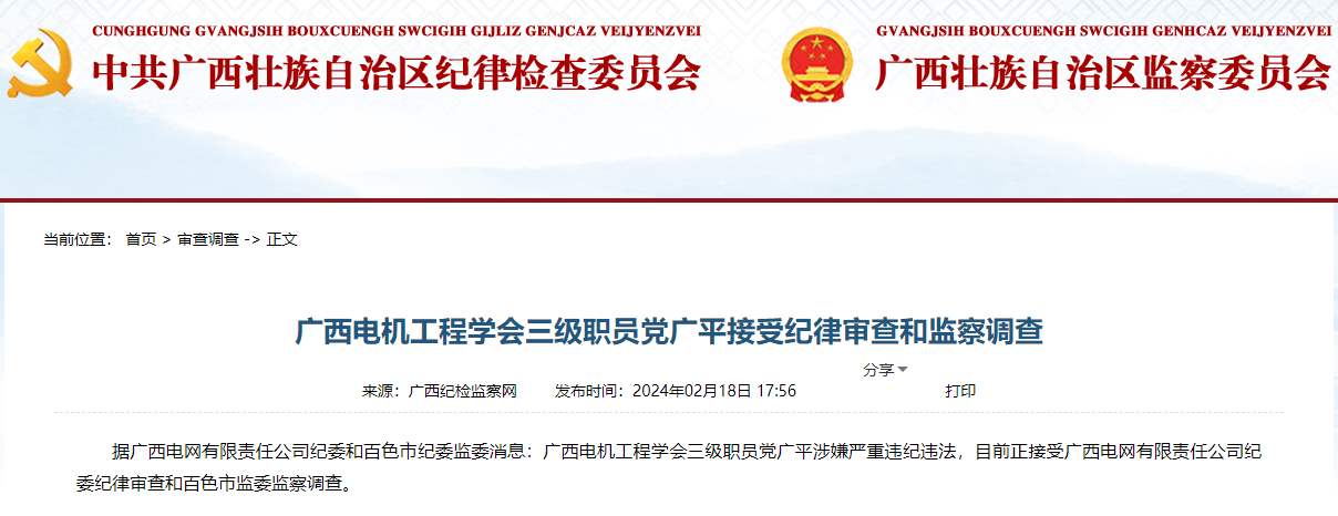 據(jù)廣西電網(wǎng)有限責任公司紀委和百色市紀委監(jiān)委消息:廣西電機工程學會三級職員黨廣平涉嫌嚴重違紀違法,目前正接受廣西電網(wǎng)有限責任公司紀委紀律審查和百色市監(jiān)委監(jiān)察調(diào)查。