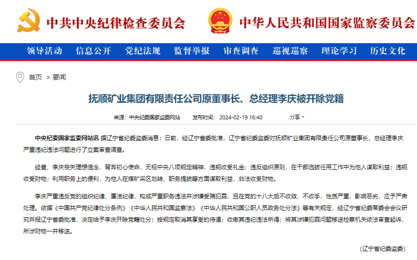 據(jù)遼寧省紀委監(jiān)委消息:日前,經(jīng)遼寧省委批準,遼寧省紀委監(jiān)委對撫順礦業(yè)集團有限責任公司原董事長、總經(jīng)理李慶嚴重違紀違法問題進行了立案審查調(diào)查。