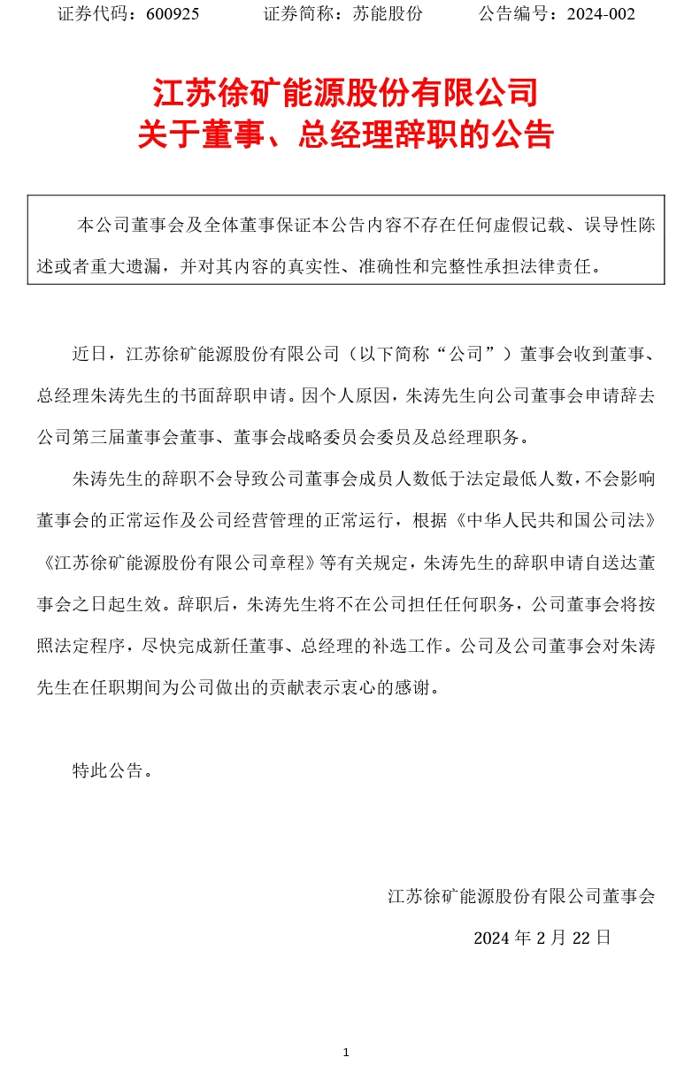 2月22日,蘇能股份發(fā)布公告,近日,董事會(huì)收到董事、總經(jīng)理朱濤先生的書(shū)面辭職申請(qǐng)。因個(gè)人原因,朱濤先生向公司董事會(huì)申請(qǐng)辭去公司第三屆董事會(huì)董事、董事會(huì)戰(zhàn)略委員會(huì)委員及總經(jīng)理職務(wù)。