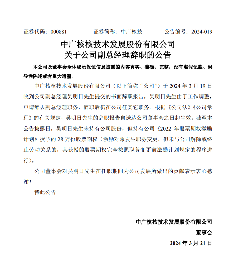 吳明日辭去中廣核核技術發(fā)展股份有限公司(以下簡稱“中廣核技”)副總經(jīng)理職務。