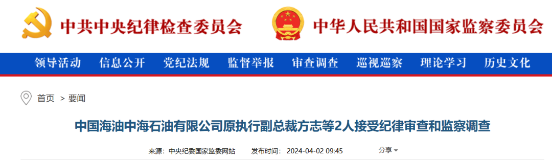 中央紀(jì)委國(guó)家監(jiān)委網(wǎng)站4月2日消息,據(jù)中國(guó)海油紀(jì)檢監(jiān)察組、江蘇省紀(jì)委監(jiān)委消息:中國(guó)海油中海石油有限公司原執(zhí)行副總裁方志、中國(guó)海油中海石油(中國(guó))有限公司天津分公司渤海地區(qū)協(xié)調(diào)工作領(lǐng)導(dǎo)小組原專(zhuān)職副組長(zhǎng)陳明涉嫌嚴(yán)重違紀(jì)違法,目前正接受中國(guó)海油紀(jì)檢監(jiān)察組和江蘇省監(jiān)委紀(jì)律審查和監(jiān)察調(diào)查。