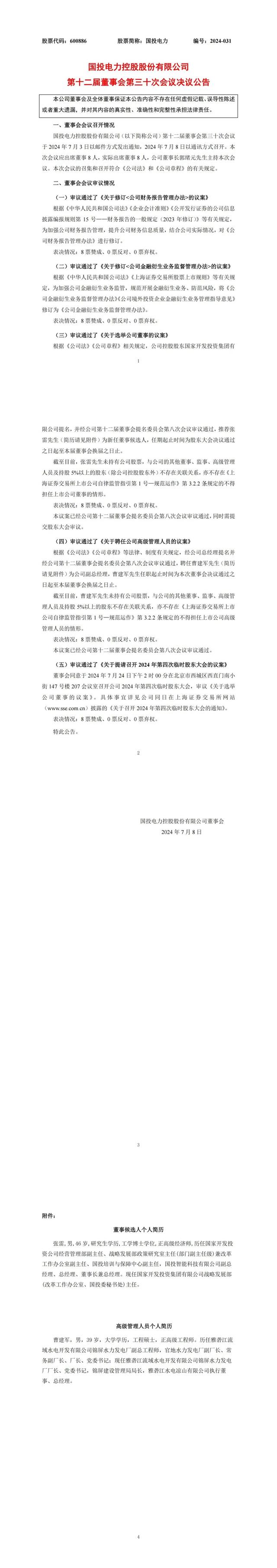 7月8日,國投電力召開董事會,審議通過了《關于聘任公司高級管理人員的議案》,聘任曹建軍先生為公司副總經(jīng)理,曹建軍先生任職起止時間為本次董事會決議通過之日起至本屆董事會換屆之日止;推薦張雷為新任董事候選人。