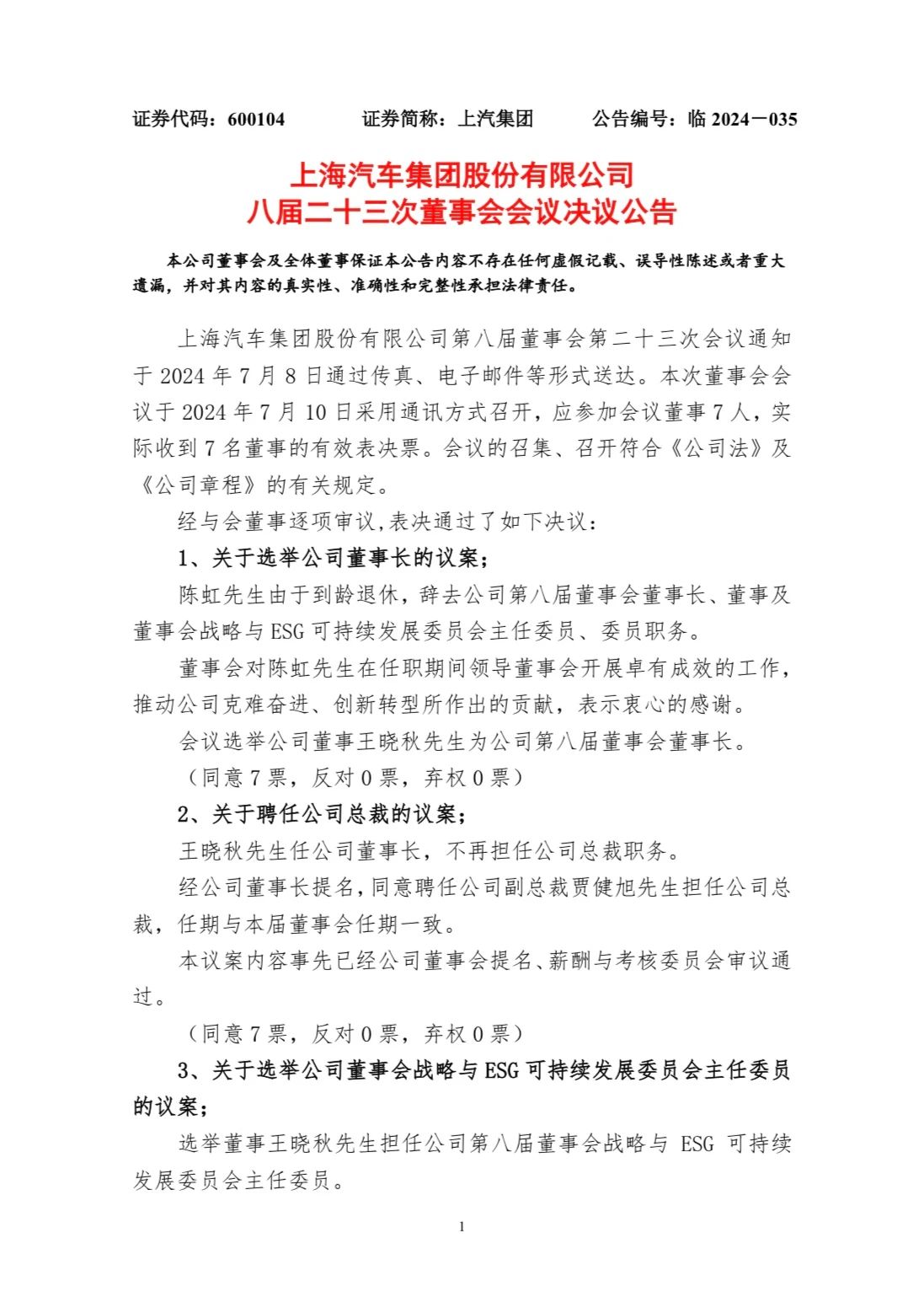 上海汽車集團股份有限公司(以下簡稱“上汽集團”)董事長陳虹因到齡退休辭去公司第八屆董事會董事長、董事及董事會戰(zhàn)略與ESG可持續(xù)發(fā)展委員會主任委員、委員職務;王曉秋任第八屆董事會董事長。