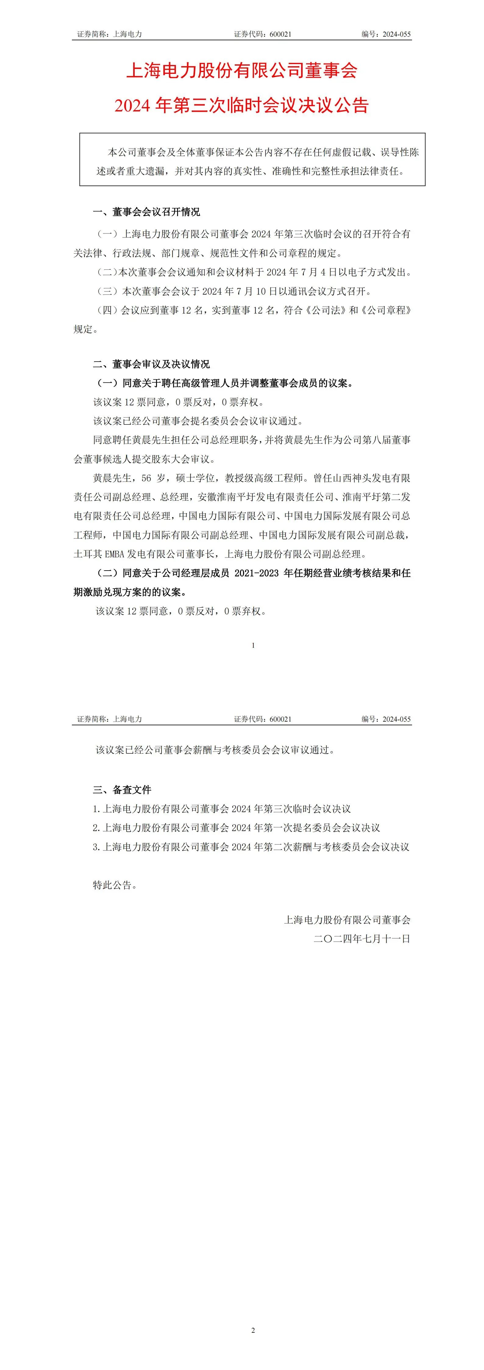 7月11日,上海電力公告,董事會同意關(guān)于聘任高級管理人員并調(diào)整董事會成員的議案,同意聘任黃晨先生擔任公司總經(jīng)理職務(wù),并將黃晨先生作為公司第八屆董事會董事候選人提交股東大會審議。