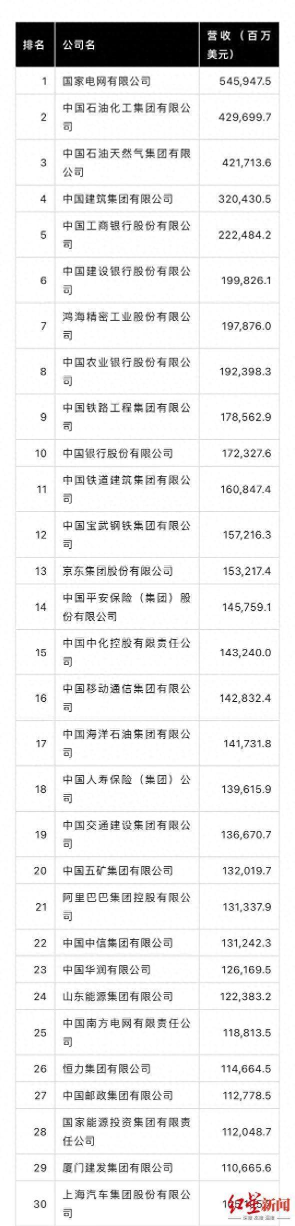 從排名看,國(guó)家電網(wǎng)有限公司以5459億美元的營(yíng)收位居榜首,中國(guó)石化和中國(guó)石油分列榜單第二位和第三位,位列第四的是中國(guó)建筑集團(tuán)。中國(guó)工商銀行(601398.SH)位列第五,排名較去年上升1位。蘋(píng)果最大代工企業(yè)鴻海精密位列第七,較去年下降2位,仍是排名最高的中國(guó)臺(tái)灣地區(qū)公司。