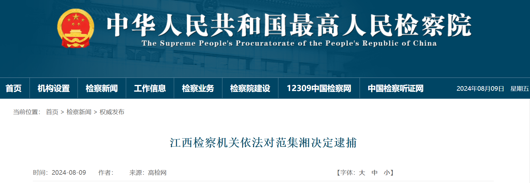 中國電力建設(shè)集團有限公司原黨委副書記、董事長范集湘涉嫌受賄、利用影響力受賄一案,由江西省監(jiān)察委員會調(diào)查終結(jié),移送檢察機關(guān)審查起訴。日前,經(jīng)最高人民檢察院指定管轄,江西省南昌市人民檢察院依法以涉嫌受賄罪、利用影響力受賄罪對范集湘作出逮捕決定。案件正在進一步辦理中。