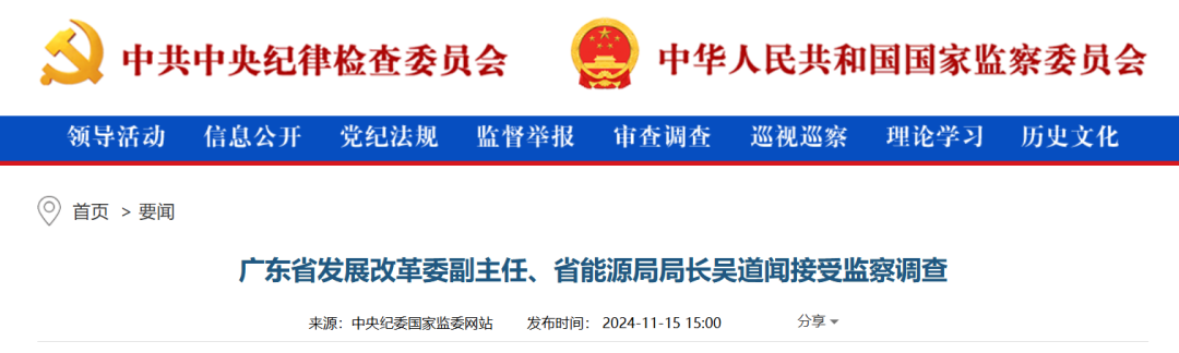 中央紀(jì)委國家監(jiān)委網(wǎng)站11月15日消息, 據(jù)廣東省紀(jì)委監(jiān)委消息:廣東省發(fā)展改革委副主任、省能源局局長吳道聞涉嫌嚴(yán)重違法,目前正接受廣東省監(jiān)委監(jiān)察調(diào)查。