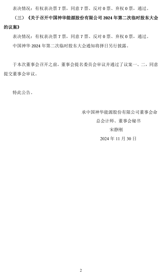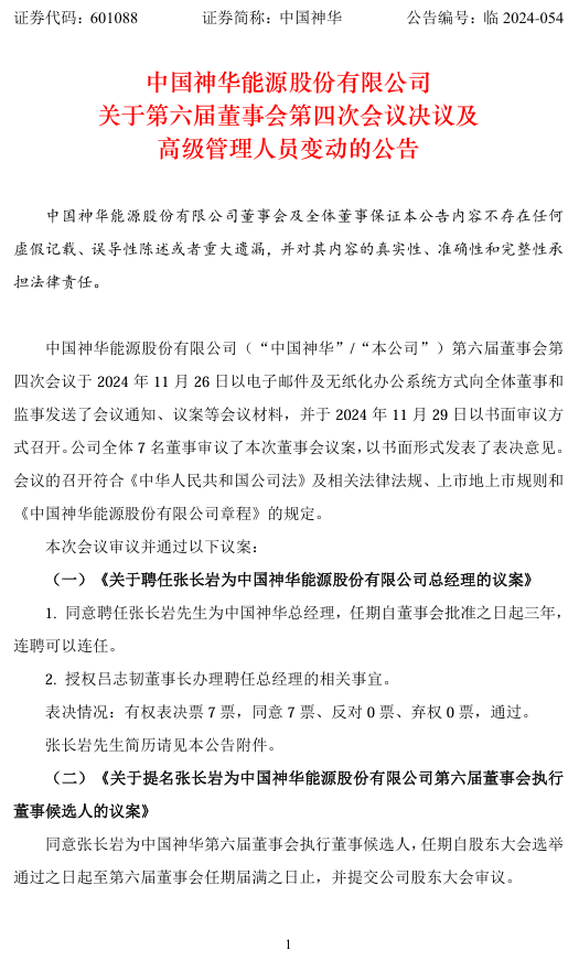 中國(guó)神華11月30日發(fā)布公告,公司第六屆董事會(huì)第四次會(huì)議于2024年11月26日以電子郵件及無(wú)紙化辦公系統(tǒng)方式向全體董事和監(jiān)事發(fā)送了會(huì)議通知、議案等會(huì)議材料,并于2024年11月29日以書(shū)面審議方式召開(kāi)。公司全體7名董事審議了本次董事會(huì)議案,以書(shū)面形式發(fā)表了表決意見(jiàn)。